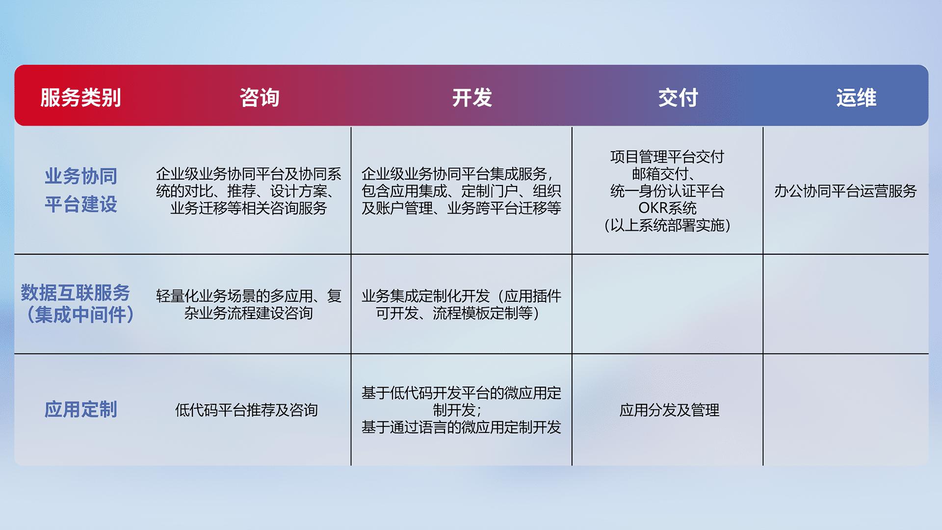 针对钉钉、、、企微、、IDaas等平台级产品提供产品的规划、、、方案、、交付、、、、定制化开发等服务,,,实现如统一协同办公、、、、智能客户服务、、、、混合会议管理、、、智能数据查询、、、、等业务场景,,实现数字化转型。。。。