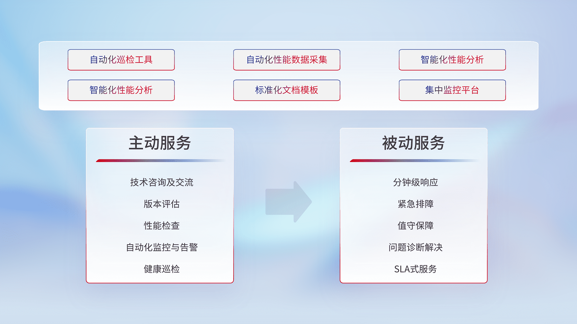智能化工具和标准化文档,,,,保障服务质量,,,提供主动服务(包含技术咨询、、、版本评估、、、、性能检查、、自动化监控与告警、、健康巡检)和被动服务包含(分钟级响应、、、、紧急排障、、、值守保障、、问题诊断解决、、SLA服务)。。。