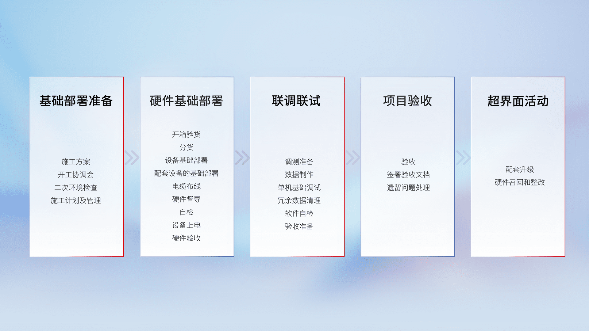 从基础部署准备、、、、硬件基础部署、、、、联调联试、、、、项目验收、、越界面活动的全过程可追溯,,,,保证施工质量和进度。。。